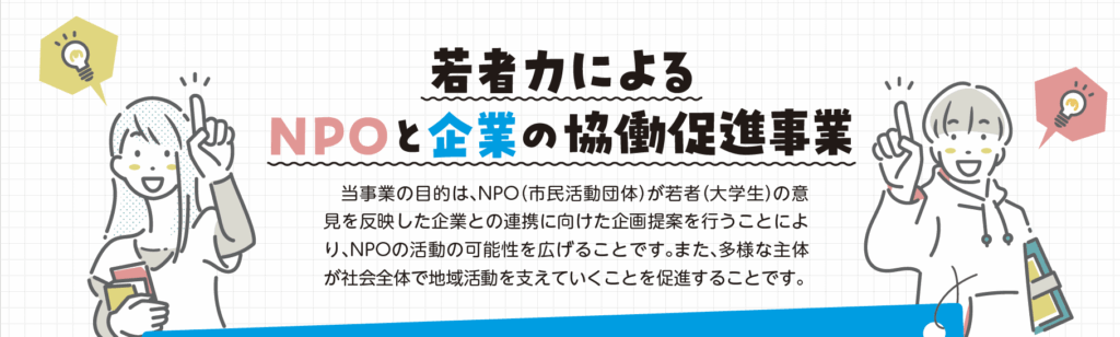 当事業の目的は、NPO(市民活動団体)が若者(大学生)の意見を反映した企業との連携に向けた企画提案を行うことにより、NPOの活動の可能性を広げることです。また、多様な主体が社会全体で地域活動を支えていくことを促進することです。